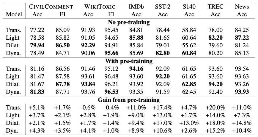 上图中 Lightweight CNN、Dilated CNN、Dynamic CNN 分别是不同的变种,可以得出以下结论: