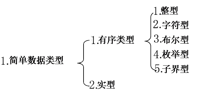 简单类型包括实数类型(Real)和有序类型(Ordinal)。有序类型又包括整数类型、字符类型、布尔类型、枚举类型和子界类型等。