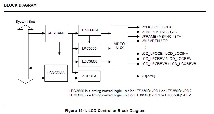 d:VIDPRCS接收来自LCDCDMA的数据,将数据转换为合适的数据格式,比如说4/8位单扫,4位双扫显示模式,然后通过数据端口VD[23:0]传送视频数据到LCD驱动器;