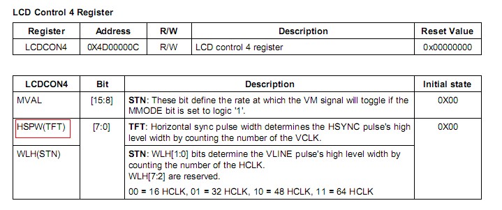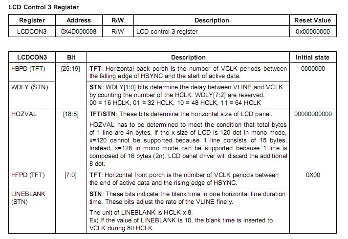 void Lcd_Init(void) { rGPCUP=0xffffffff; // Disable Pull-up register rGPCCON=0xaaaa56a9; //Initialize VD[7:0],LCDVF[2:0],VM,VFRAME,VLINE,VCLK,LEND rGPDUP=0xffffffff; // Disable Pull-up register rGPDCON=0xaaaaaaaa; //Initialize VD[15:8] //LCDCON1: TFT LCD panel,MMODE[7]=0,16bpp TFT,ENVID=off rLCDCON1=(CLKVAL_TFT_320240<<8)|(MVAL_USED<<7)|(3<<5)|(12<<1)|0; rLCDCON2=(VBPD_320240<<24)|(LINEVAL_TFT_320240<<14)|(VFPD_320240<<6)|(VSPW_320240); rLCDCON3=(HBPD_320240<<19)|(HOZVAL_TFT_320240<<8)|(HFPD_320240); rLCDCON4=(MVAL<<8)|(HSPW_320240); rLCDCON5=(1<<11)|(1<<9)|(1<<8)|(1<<3)|(BSWP<<1)|(HWSWP); //rLCDCON5=(1<<11)|(0<<9)|(0<<8)|(0<<6)|(BSWP<<1)|(HWSWP); //FRM5:6:5,HSYNC and VSYNC are inverted //LCDBANK[29:21] = (U32)LCD_BUFFER >> 22 : These bits indicate A[30:22] of the bank location for the video buffer in the system memory. LCDBANK value cannot be changed even when moving the view port. LCD frame buffer should be within aligned 4MB region, which ensures that LCDBANK value will not be changed when moving the view port. So, care should be taken to use the malloc() function. //系统内存地址A[30:22]处的Bank位置为图像缓冲。LCDBANK的值在视图移动的值在视图移动时不能改变,LCD帧缓冲应该在4MB区域对齐,保证LCDBANK的值在移动视图时不会改变。 //LCDBASEU[20:0] = ((U32)LCD_BUFFER >> 1)&0x1fffff : For dual-scan LCD : These bits indicate A[21:1] of the start address of the upper address counter, which is for the upper frame memory of dual scan LCD or the frame memory of single scan LCD. //For single-scan LCD : These bits indicate A[21:1] of the start address of the LCD frame buffer. //双扫描:表明高地址计数器的起始地址A[21:1],用于LCD双扫描的上部帧内存或者单扫描的帧内存 //单扫描:表明LCD帧缓冲的起始地址A[21:1] rLCDSADDR1=(((U32)LCD_BUFFER>>22)<<21)|M5D((U32)LCD_BUFFER>>1); //LCDSADDR2 0x4d000018帧缓冲起始寄存器2: //LCDBASEL[20:0] = ((LCD_ADDR + LCD_WIDTH * LCD_HEIGHT * 2) >> 1)& 0x1fffff = (LCD_ADDR >> 1 + LCD_WIDTH * LCD_HEIGHT)& 0x1fffff //For dual-scan LCD: These bits indicate A[21:1] of the start address of the lower address counter, which is used for the lower frame memory of dual scan LCD. //For single scan LCD: These bits indicate A[21:1] of the end address of the LCD frame buffer. //LCDBASEL = ((the frame end address) >>1) + 1 = LCDBASEU + (PAGEWIDTH+OFFSIZE) x (LINEVAL+1) //双扫描:表明低地址计数器的起始地址A[21:1],用于LCD双扫描的下部帧内存或者单扫描的帧内存 //单扫描:表明LCD帧缓冲的结束地址A[21:1] rLCDSADDR2=M5D( ((U32)LCD_BUFFER+(SCR_XSIZE_TFT_320240*LCD_YSIZE_TFT_320240*2))>>1 ); //LCDSADDR3 0x4d00001c帧缓冲起始寄存器3: //OFFSIZE = 0;PAGEWIDTH = 320 虚拟屏页宽(半字数量) 定义了帧中的视图域宽度 rLCDSADDR3=(((SCR_XSIZE_TFT_320240-LCD_XSIZE_TFT_320240)/1)<<11)|(LCD_XSIZE_TFT_320240/1); rLCDINTMSK|=(3); // MASK LCD Sub Interrupt //rTCONSEL|=((1<<4)|1); // Disable LCC3600, LPC3600 rTPAL=0; // Disable Temp Palette }