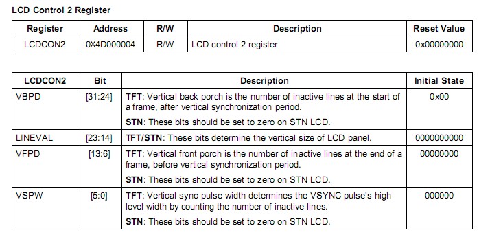 #define rGPCCON (*(volatile unsigned *)0x56000020) #define rGPCUP (*(volatile unsigned *)0x56000028) #define rGPDCON (*(volatile unsigned *)0x56000030) #define rGPDUP (*(volatile unsigned *)0x56000038) #define rLCDCON1 (*(volatile unsigned *)0x4d000000) #define rLCDCON2 (*(volatile unsigned *)0x4d000004) #define rLCDCON3 (*(volatile unsigned *)0x4d000008) #define rLCDCON4 (*(volatile unsigned *)0x4d00000c) #define rLCDCON5 (*(volatile unsigned *)0x4d000010) #define rLCDSADDR1 (*(volatile unsigned *)0x4d000014) #define rLCDSADDR2 (*(volatile unsigned *)0x4d000018) #define rLCDSADDR3 (*(volatile unsigned *)0x4d00001c) #define rLCDINTMSK (*(volatile unsigned *)0x4d00005c) #define rTPAL (*(volatile unsigned *)0x4d000050)