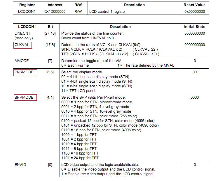 对于以上这些参数的值将分别保存到REGBANK寄存器组中的LCDCON1/2/3/4/5寄存器中:(对寄存器的操作请查看S3c2440数据手册LCD部分)
