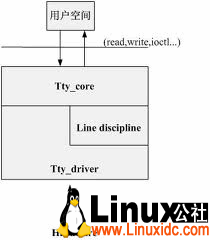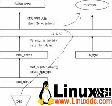 很明显的看得到由tty设备驱动到串口驱动中间经过了一层serial_core ,从tty设备驱动中需要填充的是tty_driver结构,经过串口核心层后就转变成了实现xxx_uart.c 。到现在Linux系统已经封装了终端设备(tty)的驱动,www.linuxidc.com而我们只需要实现串口驱动就能实现整个串口终端驱动。