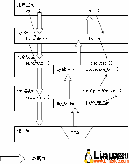上图的数据流向应该和上面tty设备驱动一样,同样需要经过tty线路规则层,不过上图箭头标的不是很准确,说明一下,因为图是从网上下的。