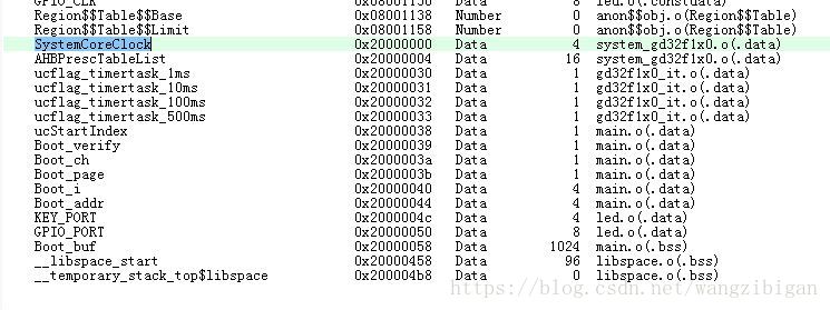 上图是符号表中Global Symbols的一部分,可以看到内存开始地址0X20000000,放置的是SystemCoreClock这个变量,这个是系统时钟频率,初始时不为0,后面记上(.data)。后面的Boot_buf变量,大小为1024,标记为(.bss)。
