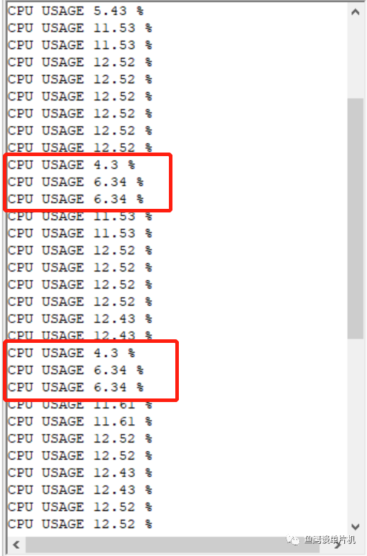 系统每隔1毫秒需要进入systick执行一次(或者其他中断执行时间),如果说任务的执行时间超过1毫秒,那么中间必然会先执行中断,再执行任务,这样一来,因为中断的插入,导致时间不再那么准确了。而当你把打印的时间控制在 1 毫秒以内,那么CPU使用率会变的非常稳定。