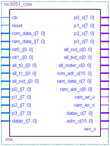 该部分的8051内核的顶层信号引脚在8051内核的顶层便可查看到各个引脚模块的定义。引脚的定义和普通的8051单片机相似,区别在于P3口的定义,普通的8051单片机的P3口有双重功能,在对普通的8051单片机编程时,特别是用C进行编程时所面向的是寄存器层面的,但在硬件层面上,在定义P3口的两种功能时是不一致的,原因是用C编程时,编译软件已经将C代码转变成机器代码,让机器能够辨别要用哪一个硬件模块,也就是8051的内核已经"解码"了机器码。普通的8051芯片的引脚框图和P3口的定义如下如下: