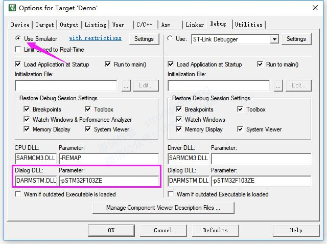 修改这两处参数为:DARMSTM.DLL -pSTM32F103ZE