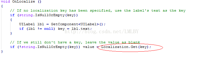 动态本地化实现:NGUI提供一个UILocalize组件,要实现动态时替换需要为每个UILabel添加该组件,添加完该组件后运行时会自动读取映射表替换label值,找该值的方法在UILocalize.cs中的OnLocalize()中实现,我们可以把value的获取方式改为读取自己的配置获取