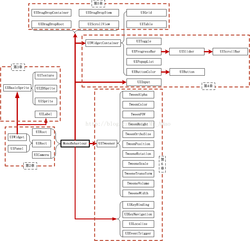 本书选择直接从版本3.8.0入手,全面系统的介绍了变革后的NGUI!全书是围绕下面的组件类继承图展开讲解的,同时也考虑到了内容的相关性,相信此书能让读者快速、高效、全面的掌握NGUI!