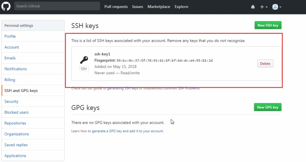 添加公钥完成后进行测试公钥(测试SSH链接)