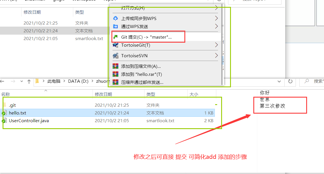 1.修改代码需要推送到远程 2.然后在拉取 从远程仓库拉取到本地 3.在推送和拉取的过程中一定会出现冲突问题 4.出现冲突的时候 可以进入文档手动解决冲突 5.冲突解决之后 右键小乌龟 点击“解决冲突” 6.然后再次推送即可 为什么会有冲突 简单来说就是A B C程序员一起开发一个项目 A把写好的代码上传到远程仓库之后 B不知道 B自己写好的代码也想提交到远程仓库 但是这个时候本地仓库的代码不是最新的 不是A上传的新的版本代码 那我们应该拉取远程仓库的代码 但是A 和 B一起修改了一个controller文件代码 在拉取的过程中就会出现冲突