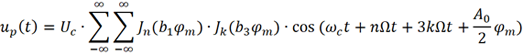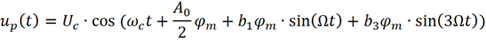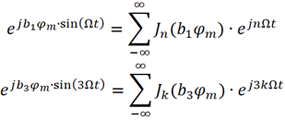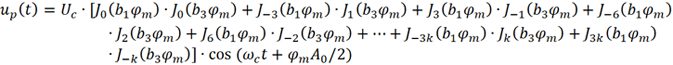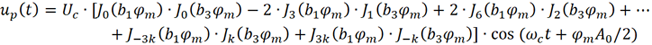 实际中调制信号还包含丰富的谐波分量,因此对载波进行相位调制后的频谱更加丰富。面对的困难是,考虑的谐波越多,公式推导越复杂。为了简化,下面只考虑到3次谐波。