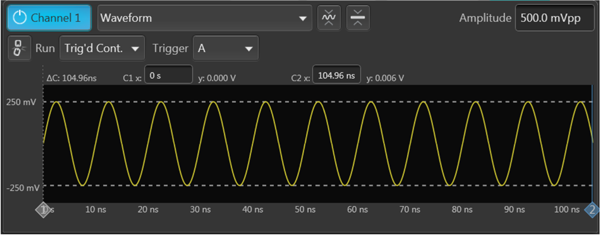 使用AWG 输出一个100MHz 频率的CW 信号,波形时长为10.5个周期,如图3所示,当循环播放时便可以模拟上述的相位不连续性,会造成180°的相位跳变。