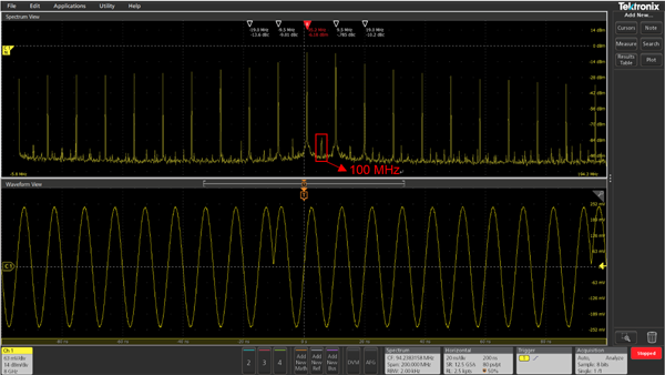 对于这种波形时长不是信号周期整数倍的情况,当单次播放时,信号的频率就是100MHz ,但是当连续播放时相当于引起了相位调制,按照上述理论分析,频谱中将包含很多频率成分,图4给出了信号的实测频谱。