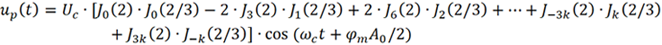 (1) 首先考虑载波ωc的幅度,以上面考虑到三次谐波的情况为例。当nΩt+3kΩt=0 时,对应的就是载波分量。这要求n=-3k (k 为整数),此时可以得到: