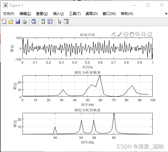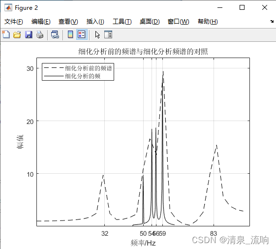 运行程序后得上图。在图1中画出了细化分析前FFT的结果,可以看到50~59Hz的4条谱线重合在一起,区分不了;而细化分析后4条谱线清晰可见。