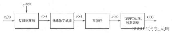 经典的复调制频谱细化FFT步骤为:复调制移频→低通数字滤波→重采样→FFT及谱分析→频率调整。其原理过程如下图所示。