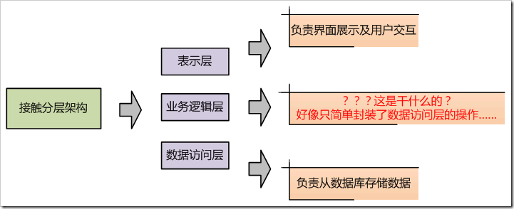 如图1-1所示,我们先接触了分层架构,然后对每个层产生了初步的认识。其中,由于表示层和数据访问层的代码职责清晰明确,基本能正确认识。但是,由于我们接触的分层架构的Demo大多业务极其简单,又基本是CRUD操作集中型的业务。所以,我们脑子中就产生了疑问:这个所谓的业务逻辑层是干什么的?怎么就简单封装了一下数据访问层的操作?这有存在的必要吗?由于有了这种“先入为主”的误导,使得很多朋友脑中将“业务逻辑”和“业务逻辑层”两个概念混淆了,始终想不明白这东西到底是什么,做什么用的。再加上很多朋友所看的、所做的系统都是CRUD操作集中型的,就形成了“业务逻辑貌似就是对数据访问操作的简单封装”这一片面概念。