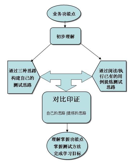 上图是如何快速掌握一个业务功能点的测试方法,建议分为两步去进行,一是自己构建自己的测试思路,另外就是通过阅读,执行已有的测试用例,提炼出测试用例的设计思路,两者进行互相借鉴印证,从而不仅学习到了业务功能知识点,还能掌握业务功能点的测试设计方法。