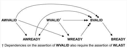 为防止死锁,通道握手信号需要遵循一定的依耐关系。①VALID信号不能依耐READY信号。②AXI接口可以等到检测到VALID才断言对应的READY,也可以检测到VALID之前就断言READY。下面有几个图表明依耐关系,单箭头指向的信号能在箭头起点信号之前或之后断言;双箭头指向的信号必须在箭头起点信号断言之后断言。