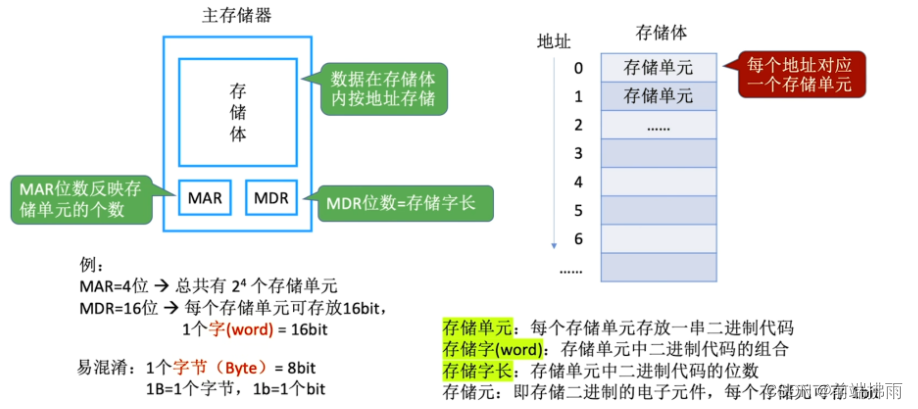 3、存储字长:存储单元中二进制代码的位数,一般是 8bit 的倍数。