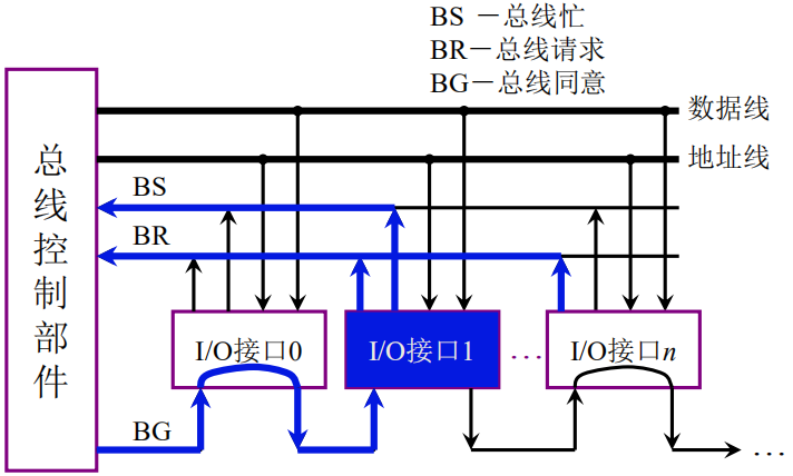 - 步骤三:当BG信号遇到请求I/O,便通过该I/O设置BS(总线忙)=1,表示总线已经接收了请求,不在接收请求了。