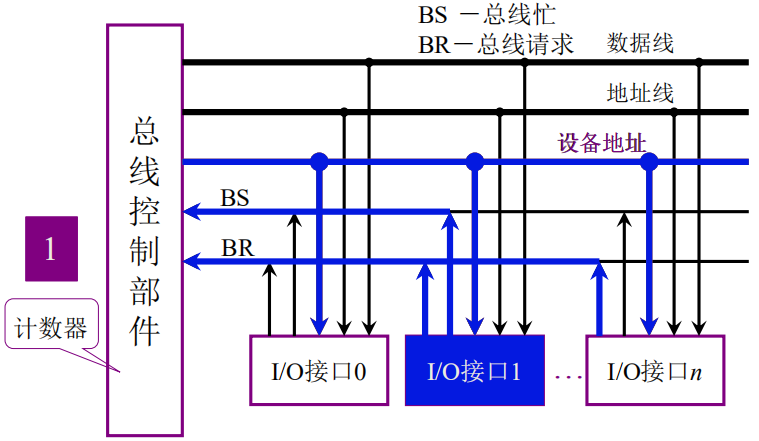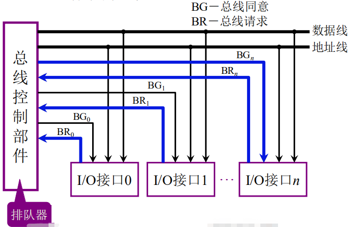 - 步骤一:在这个图中有从0开始的n个I/O接口,全部向总线控制部件发出总线占用请求。