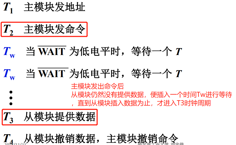 - 结束阶段:有关信息在总线上撤销,让出总线权。