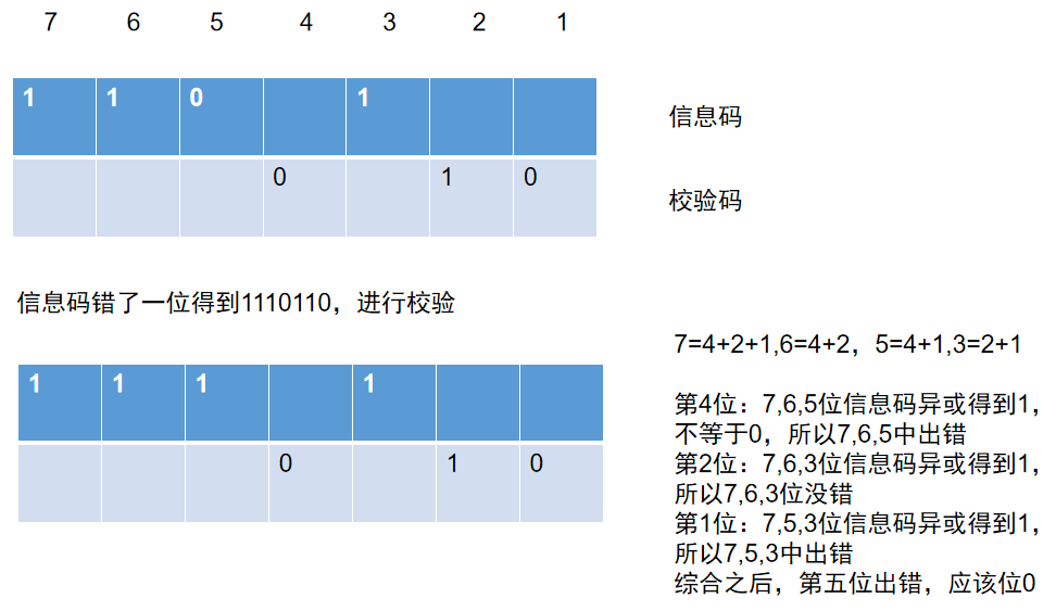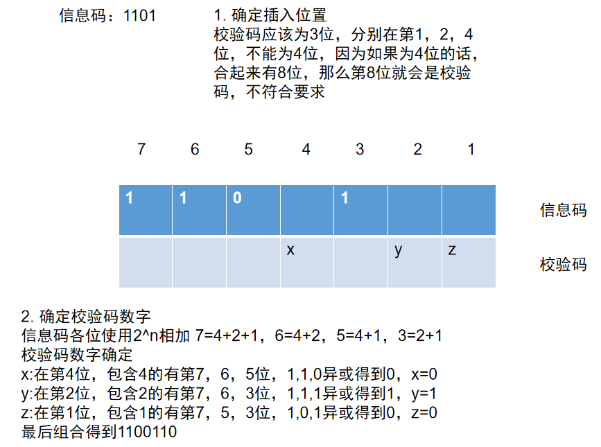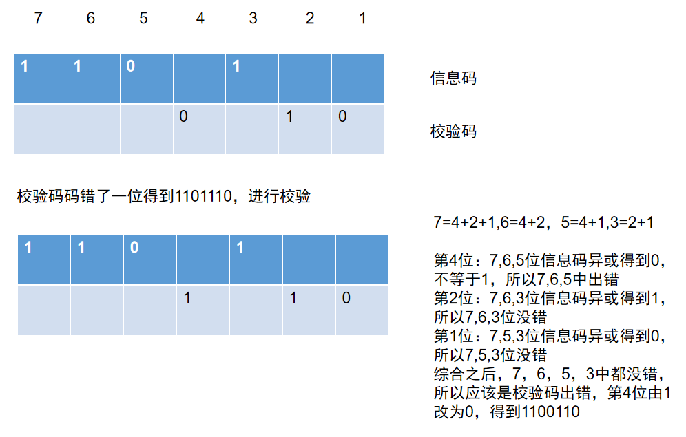与奇偶校验码和循环冗余校验码CRC不同的是,不但可以检错,还可以确定哪位信息码出错了,进行纠错