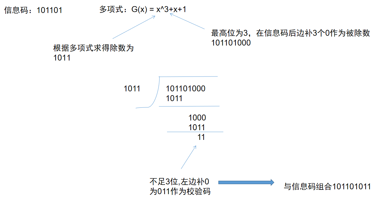 - 将校验码放到信息位后边发送出去,接收方接收到之后,也根据这个多项式得到的除数做除法,如果能除尽,则说明数据没有出错。