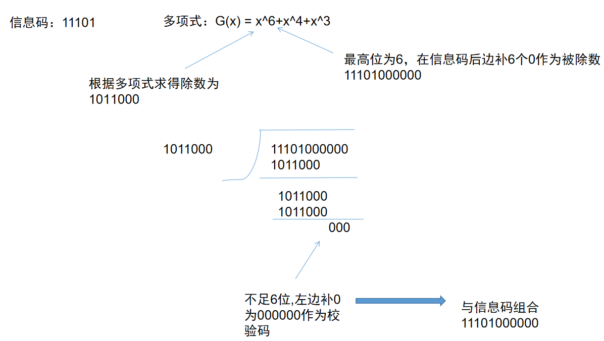 - 最后的余数的位数,如果不足多项式最高次数n,则在左边补0,最后得到的数为校验码
