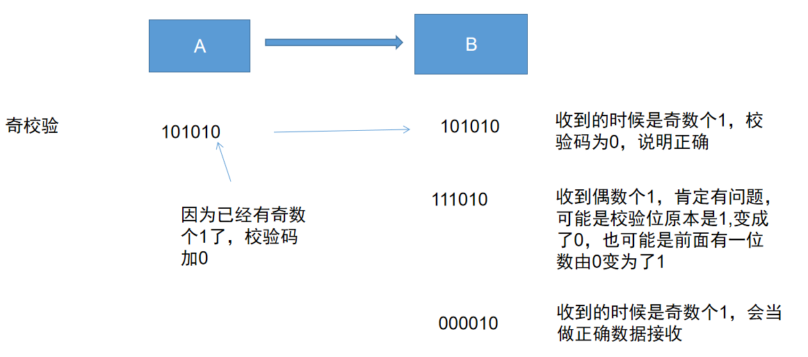 - 奇偶校验就是在原本的编码最后面加一位校验码(注意只加一位),使得编码中1的个数为奇数(奇校验)或偶数(偶校验),这样码距就变成了2,也就是在传输一个编码时,这个编码最少变两个数,才会在接收的时候被当做正确数据接收。其实如果变得数多于两位,也必须是偶数个,才会被当做正确数据接收。