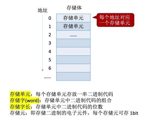 总容量 = 存储单元个数 X 存储字长 bit (一个Byte == 8 bit)