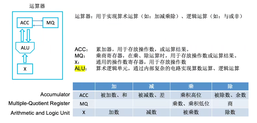 运算器:算数运算和逻辑运算。