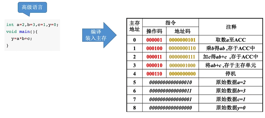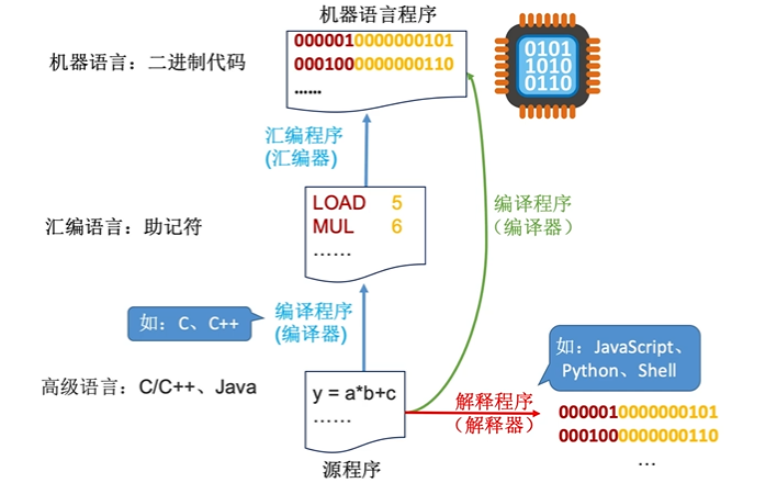 - 解释程序:将源程序的一条语句翻译成对应的机器语言的语句,并立即执行。紧接着再翻译下一语句(每次执行都要翻译)