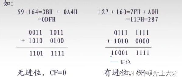 (1)两个无符号数相加,和为正数,当和超过其位数所允许的范围时,向更高位进位,用CF(进位标志位)表示。
