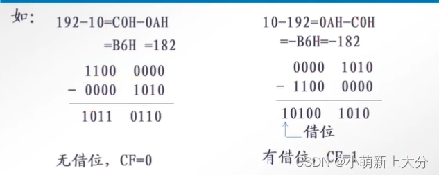 对于无符号数进行减法运算,其结果的符号用进位来判断:CF=0(无借位)结果为正;CF=1(有借位)结果为负