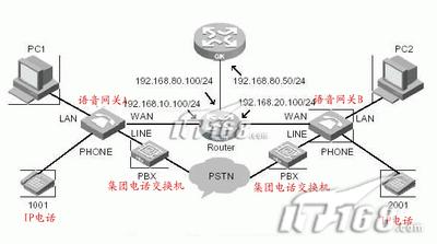 VoIP网关型的应用是将VoIP语音网关的FXO/FXS接口同总部或分支机构的PBX(小交换机或集团电话)直接相连,当需要打长途电话时,将话音转到VoIP网关上,通过因特网传输。用户在使用时只需在分机上先拨IP电话特服号(如可设为"8"),便可直接拨打IP电话。