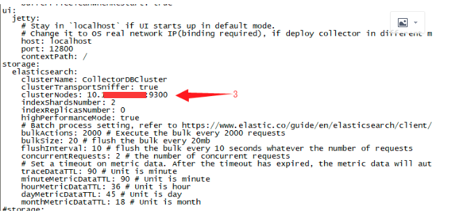 3.表示当前的elasticsearch的连接配置,只需要配置clusterName和clusterNodes就行,如果有多个节点,则IP:prot之后用逗号隔开;clusterName必需agnet和collector一致;