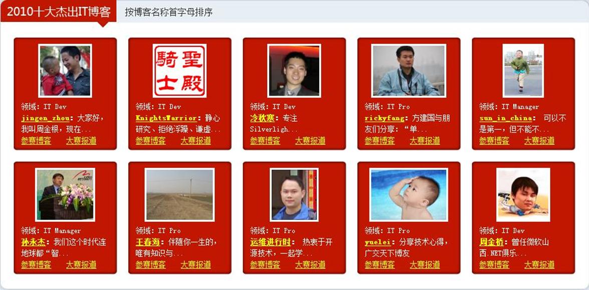 自2010年11月开赛以来,大赛共有近千名博主报名,300余名IT原创博主通过审核,拥有了独立参赛主页。经过一个多月的角逐,根据十余万网 友票选的支持结果,年度IT博客50强产生。随后,专家评委团从专业程度、互动人气 、文字表达、版面美观等各方面,对50强选手进行评分。1月20日,十位博主凭借实力与人气成功当选“2010年度十大杰出IT博客”!