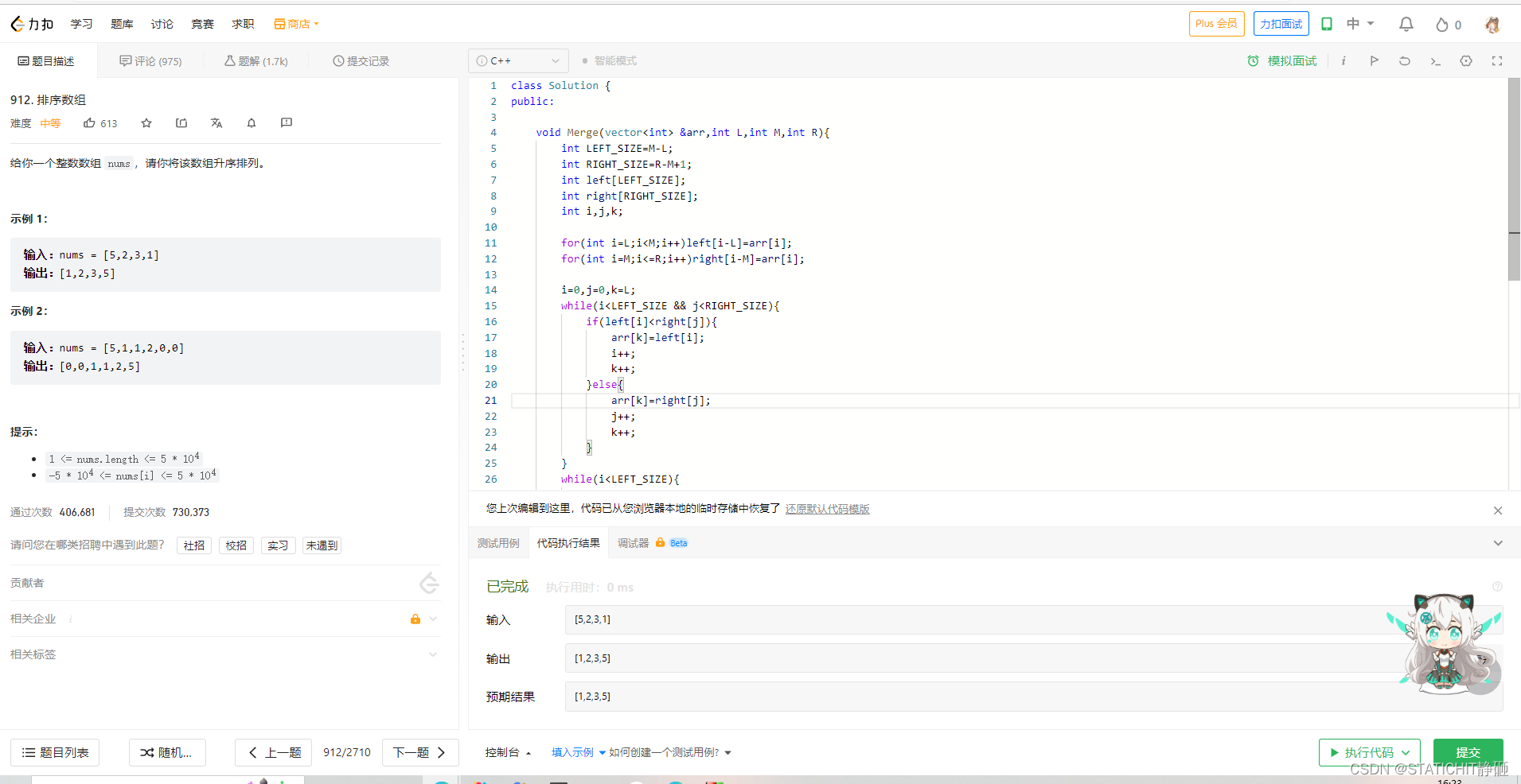 然后在力扣上做了这道手撕题,不知道为什么,题目明明是手撕归并排序,手写完效果好像不太理想,可能交题的人里面直接sort的人太多了!!