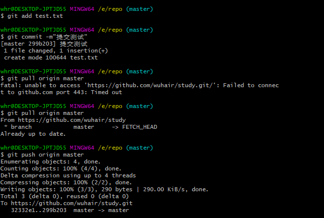 - push才是真正提交到远程仓库。 git push origin master