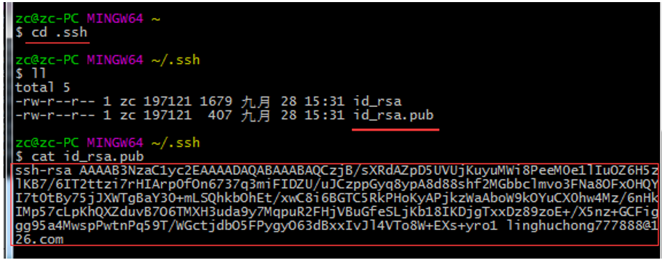 进入.ssh文件包,打印id_rsa.pub的内容,复制全部内容