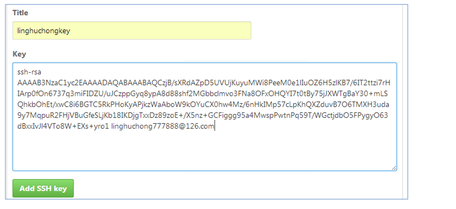 Title随便写,Key 把之前id_rsa.pub的内容复制进去,点击Add SSH key,设置ssh key 完成。