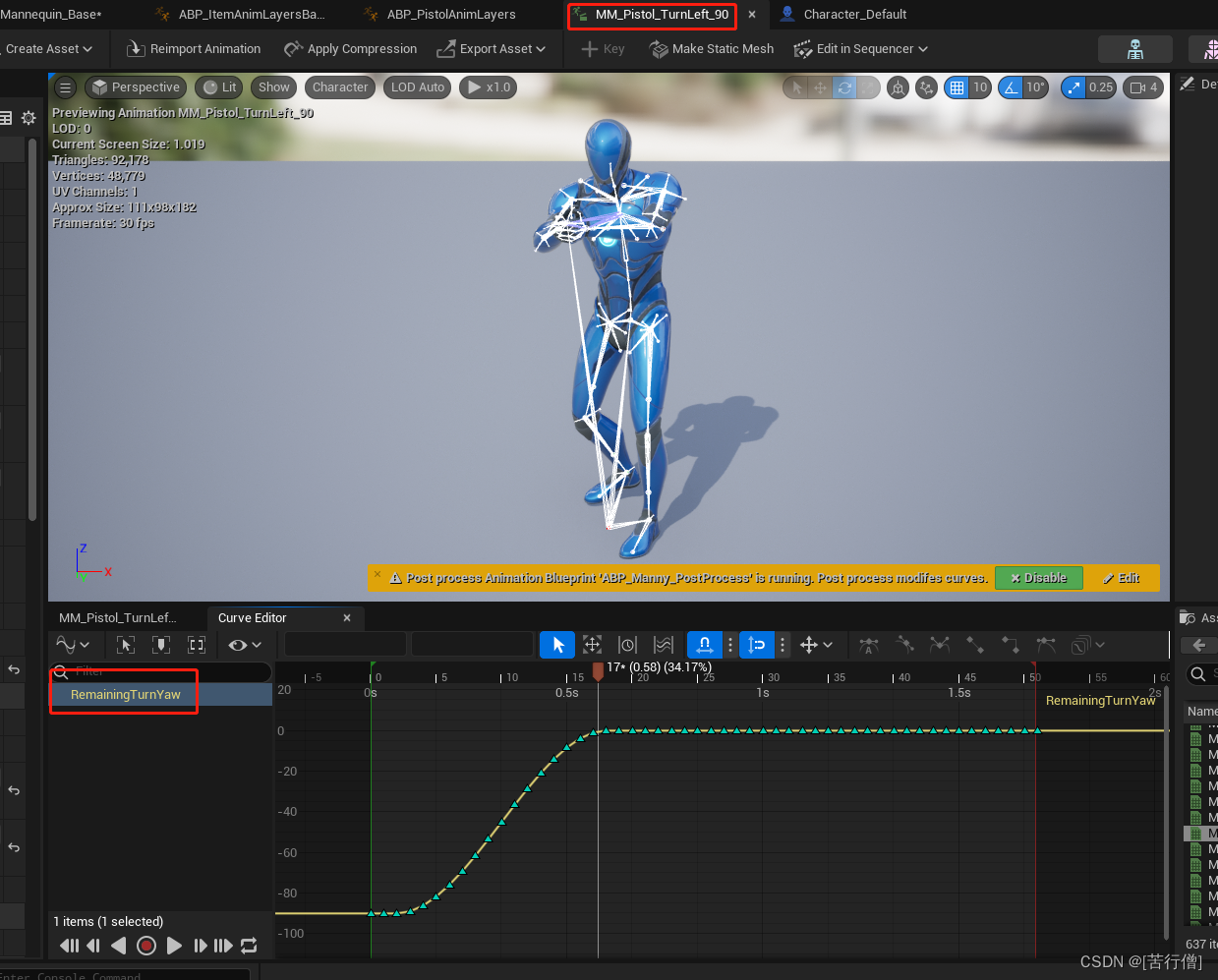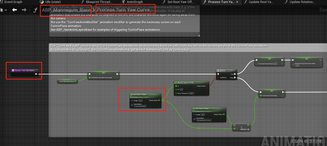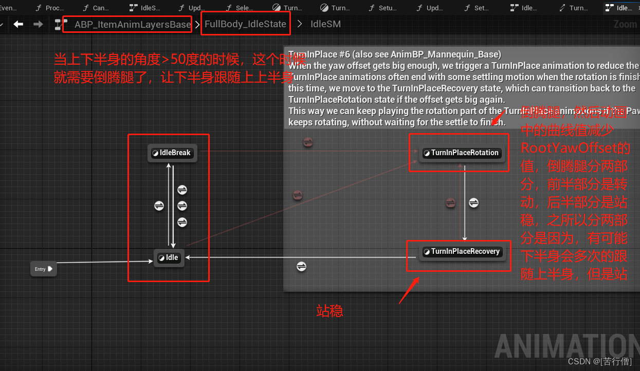 这个倒腾腿的动画 其实并没有rootmotion,就是说 root并没有旋转,只是在原地一个腿部的动作,但是这个动作的每一帧对应的旋转角度是写在remaining turn yaw的curve中,于是在逻辑处理中 时刻提取这个curve的值然后和RootYawOffset做对应的逻辑处理。