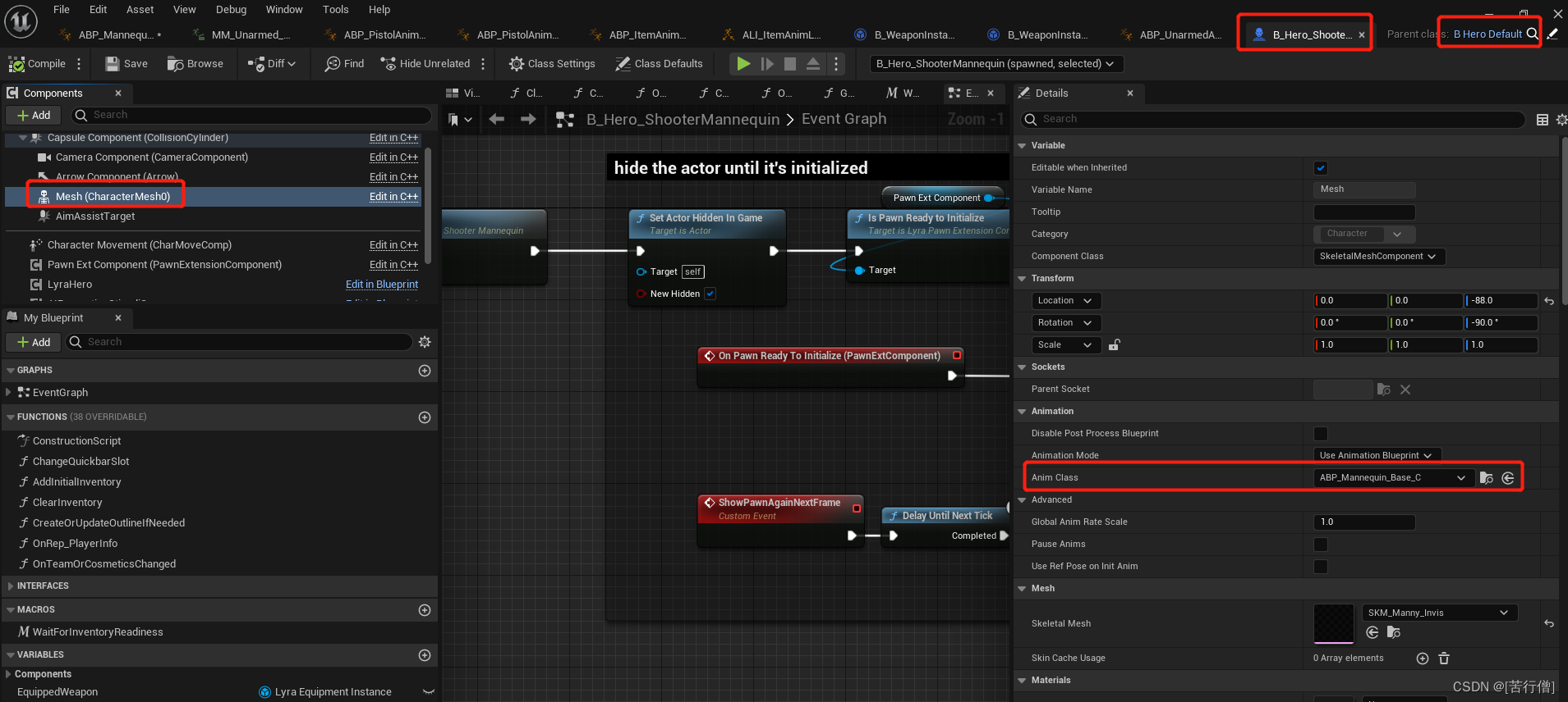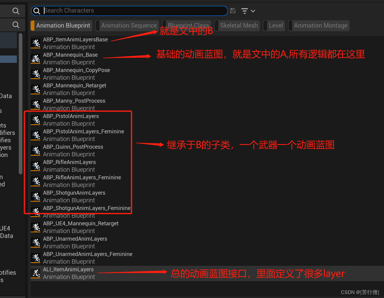 基础角色用了A动画蓝图( ABP_Mannequin_Base),A继承了一个接口AI,