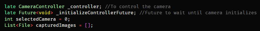 WidgetsFlutterBinding.ensureInitialized(); //Ensure plugin services are initializedfinal cameras = await availableCameras(); //Get list of available cameras