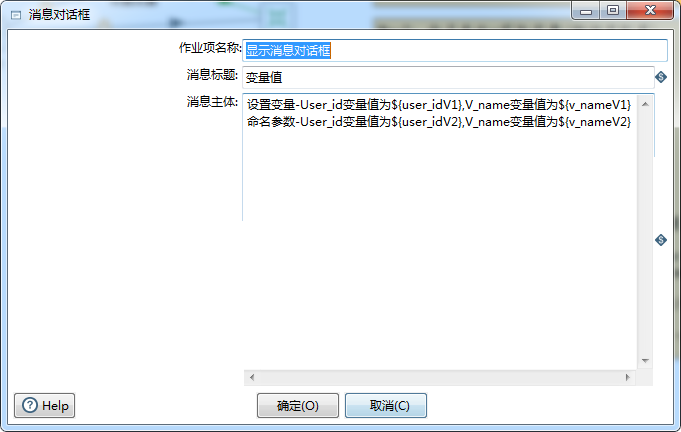 Step5:拖个消息框组件(作业的应用分类下),SHIFT连接转换与该组件,同时配置消息组件见下: