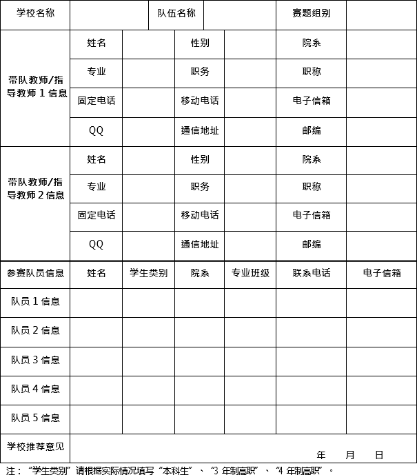 (2)参赛团队成员名单以比赛报到时加盖学校公章的纸质报名表为准。参赛团队同时需要在竞赛网站上登录进行报名。